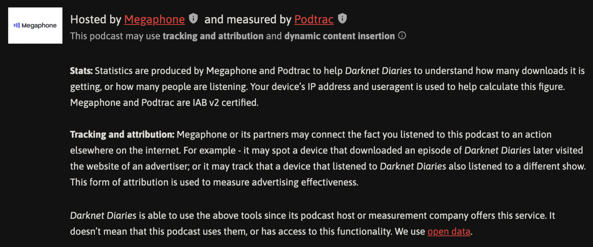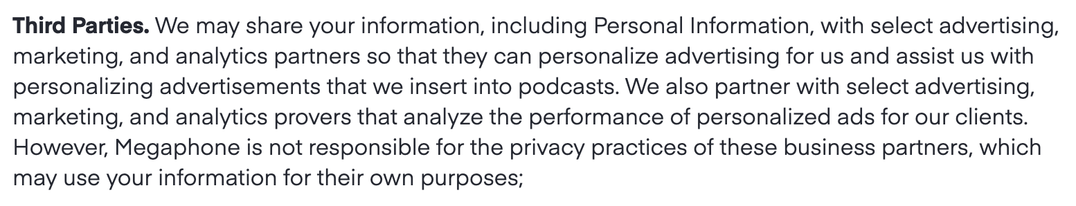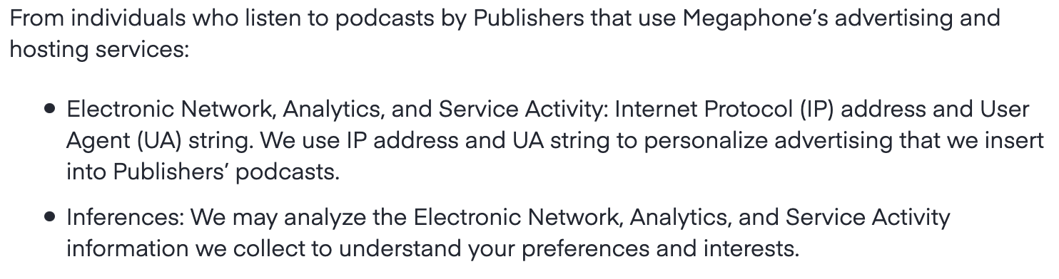 So Megaphone makes it clear they are collecting listener data and sharing it with ad tech companies (such as Neilsen) to insert targeted ads into podcasts.