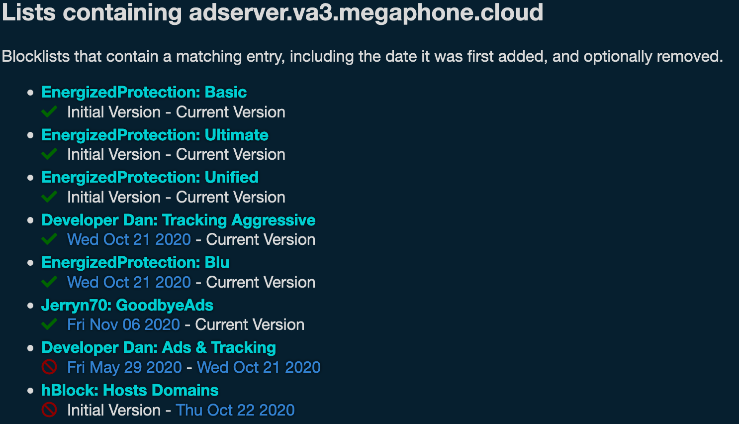 (The ones with the green check marks means it appears in the blocklist. The red ones mean it was on the list previously.)