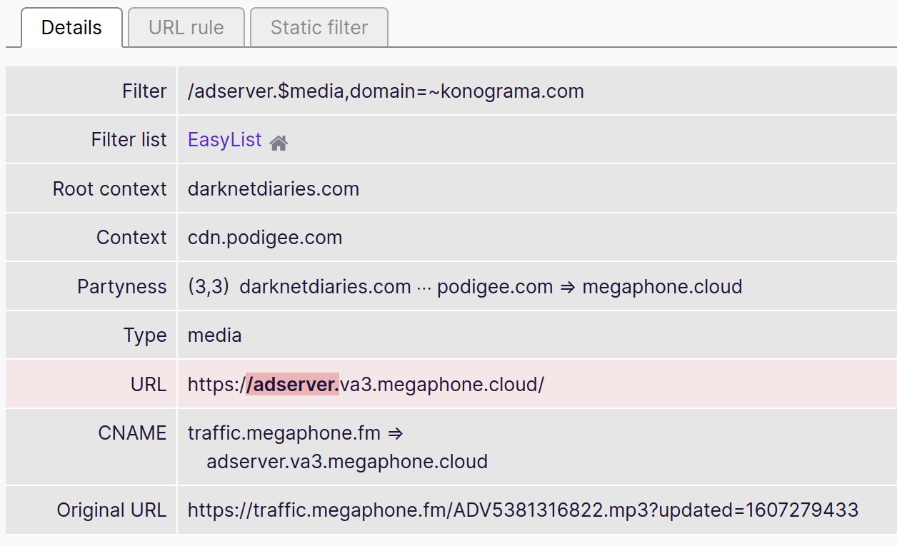 Once again, when someone goes to listen to a podcast (mp3) hosted on Megaphone it first goes to traffic.megaphone.fm which is just a CNAME for adserver.va3.megaphone.cloud. And this does show up on some blocklists.