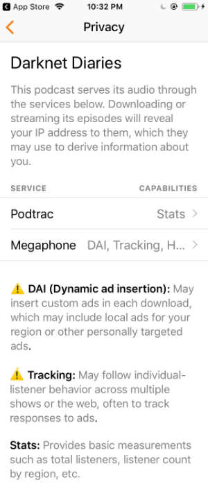 Overcast is an iOS podcast player and it has recently began warning users that Megaphone tracks listeners. Here is what it says: